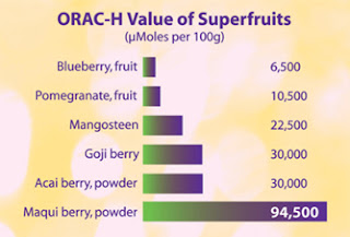 Maqui Berry ประกอบ ด้วยสารต้านอนุมูลอิสระ มีประสิทธิภาพในการทำลายและเผาผลาญอาหารสารอนุมูลอิสระมีผลต่ออายุและ เป็นสาเหตุของการอักเสบ, ความเสียหายระบบหัวใจ, หลอดเลือดและทำลายระบบการทำงานของระบบประสาท ทำให้การทำงานของภูมิคุ้มกันบกพร่องและรวมถึงก่อให้เกิดการเปลี่ยนแปลงของ เซลล์มะเร็งในร่างกาย ระดับ ของสารต้านอนุมูล อิสระในอาหารหรืออาหารเสริมวัดจากค่า ORAC ค่าของ ORAC ที่สูงนั่นแสดงว่ายิ่งมีศักยภาพในการต้านอนุมูลอิสระ ซึ่งแผนภูมินี้จะแสดงถึงระดับของสารต้านอนุมูลอิสระพิเศษใน Maqui เบอรี่เมื่อเทียบกับผลไม้ชนิดอื่น ๆ |